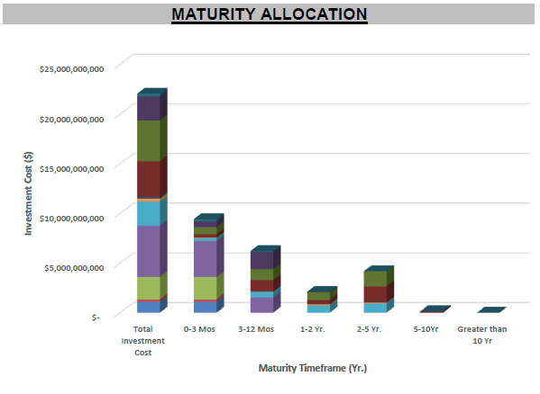 The State Treasury, totaling approximately $22.1 billion, is comprised primarily of treasury and agency securities, investment grade corporate notes, commercial paper, money market funds, and bank deposits. Roughly half of the State Treasury - the Liquidity Portfolio - is invested in cash, cash equivalents, and money market securities with a weighted average maturity of 60 days. The remainder of the State Treasury is invested in securities maturing in 2-5 years, and has an average duration of 2.5 years.